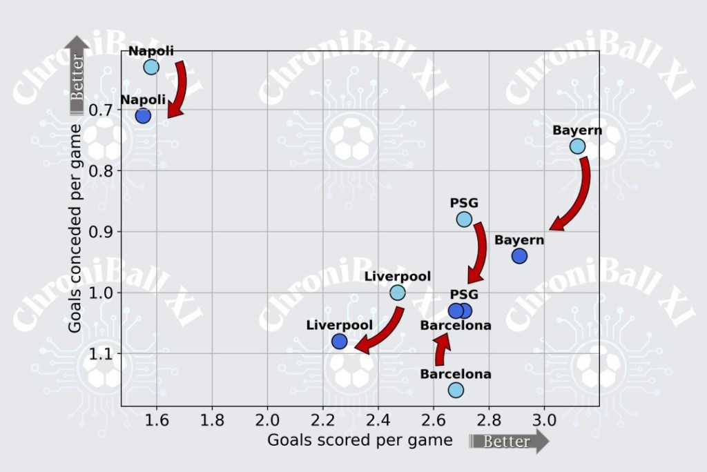 Using the same logic, the graph below presents the performance trajectory of the champions based on points earned per game (horizontal axis) and goal difference per game (vertical axis). Each circle reflects a team’s standing according to these metrics at two key points in the season (sky blue for mid-season values and darker blue for end-of-season performance). Moving rightward on the graph indicates improved efficiency in securing results (more points per game), while upward movement reflects greater consistency and dominance (higher goal difference). Likewise, the red arrows trace each team’s progression from mid-season to the end of the season, offering insight into how their overall effectiveness evolved.