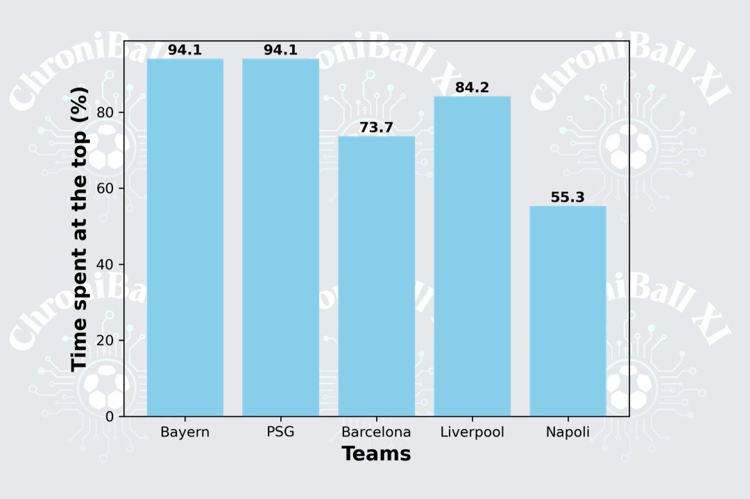 ○ Napoli led the Serie A table for the majority of the 2024/25 season, spending 21 out of 38 matchdays (55.3%) at the top. Inter followed with 9 matchdays (23.7%), while Atalanta led for 5 matchdays (13.2%). Juventus, Udinese, and Torino each briefly topped the table for a single matchday (2.6%). Despite competition in the season, Napoli ultimately established themselves as the most consistent frontrunners and were able to secure the title with a narrow one-point advantage over Inter.