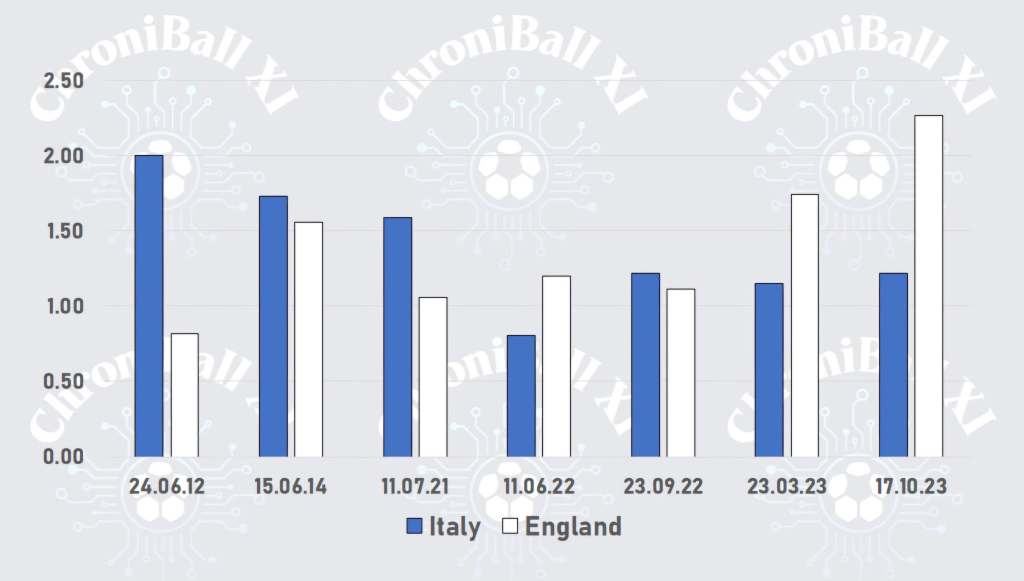 Italy has officially faced England 7 times since 2005, realized 2 wins besides 3 draws and 2 losses. In average, Italy dominated the ball by 51% versus 49% for England, shot in total 42 times on English net succeeding in scoring 6 goals while England has taken 31 shots on target out of which 7 goals have been scored. Unfortunately for Italy, the 2 losses are the results of the last two confrontations with the chart showing a pronounced power factor for the Three Lions team. All in all, since the final game of UEFA Euro 2020, the power factor variation reveals that Italy has lost the upper hand it had against England before that year.