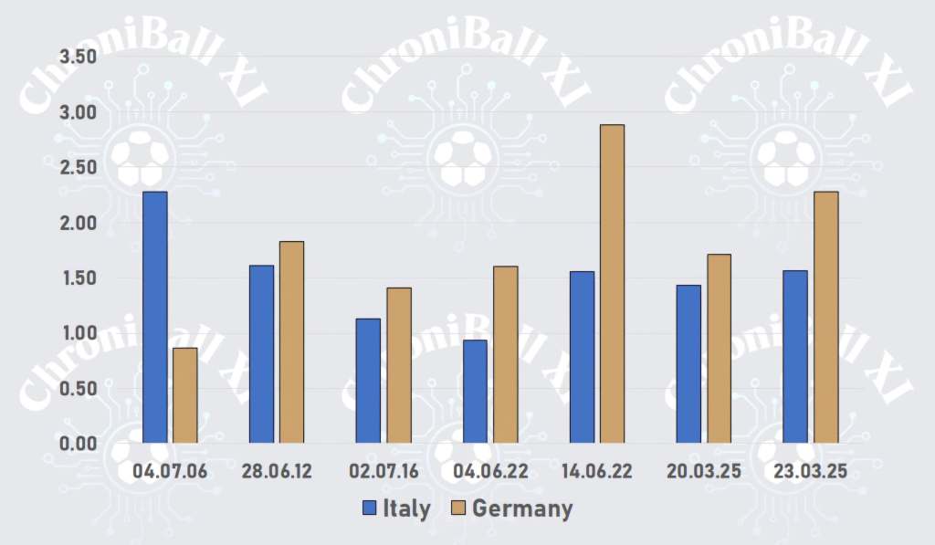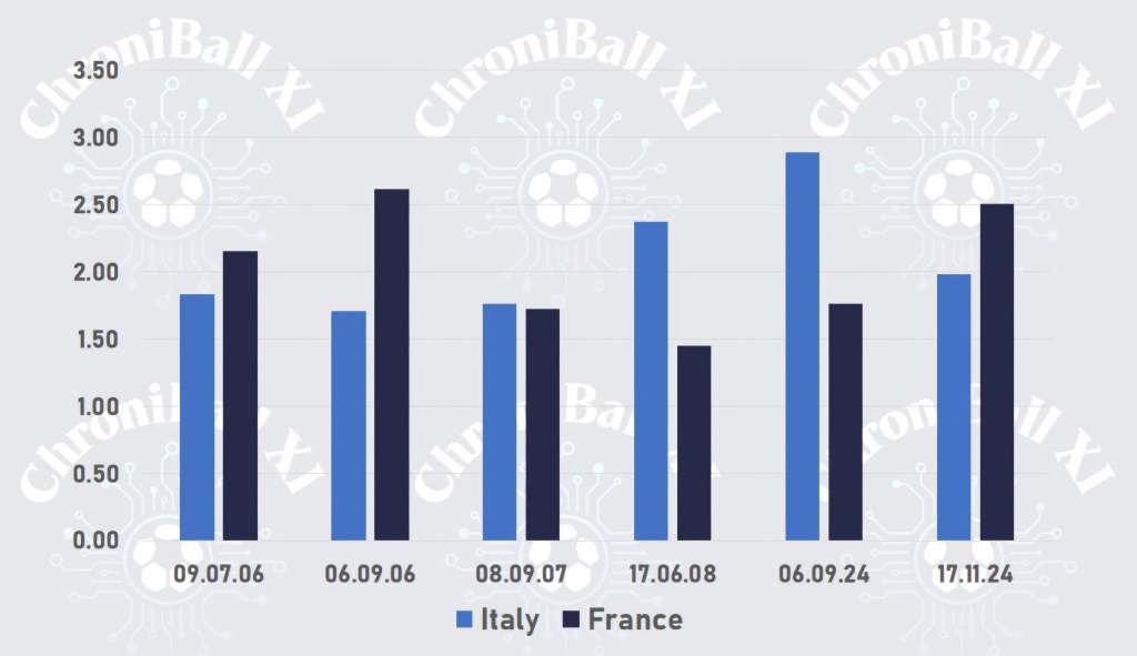 Italy has officially faced France 6 times since 2005, realized 2 wins besides 2 draws and 2 losses. In average, Italy dominated the ball by 51% versus 49% for France, shot in total 26 times on French net succeeding in scoring 8 goals while France has taken 25 shots on target out of which 8 goals have been scored. Despite the overall Italian drop and the French boost in recent years, the confrontations between two sides have been always balanced with power factors scored by Italy reaching very satisfying values, slightly below 3 in the Nations League game in September 2024.