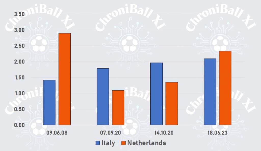 Italy has officially faced The Netherlands 4 times since 2005, realized 2 wins besides 1 draw and 1 loss. In average, Italy dominated the ball by 51% versus 49% for Holland, shot in total 18 times on Dutch net succeeding in scoring 5 goals while The Netherlands has taken 20 shots on target out of which 6 goals have been scored. In line with the power factor chart below, all those numbers show a global balance between both sides.
