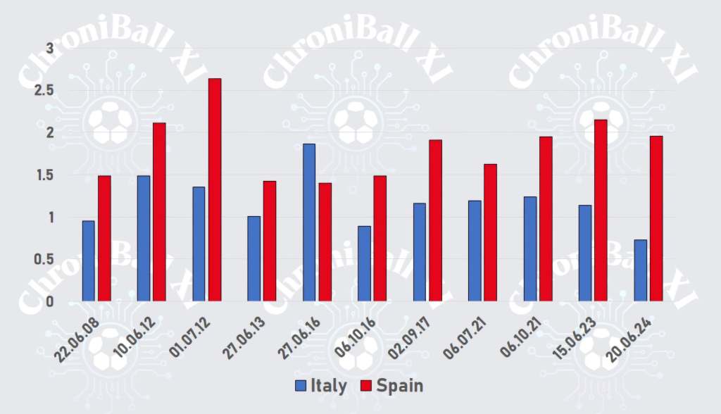 Italy has officially faced Spain 11 times since 2005, realized a single win besides 5 draws and 5 losses. In average, Italy dominated the ball by 41% versus 59% for Spain, shot in total 43 times on Spanish net succeeding in scoring 7 goals while Spain has taken 64 shots on target out of which 15 goals have been scored. The chart clearly states the permanent upper hand Spain is having over Italy, except this confrontation in round of 16 on June 27th, 2016 where even the power factor has remained below 2.
