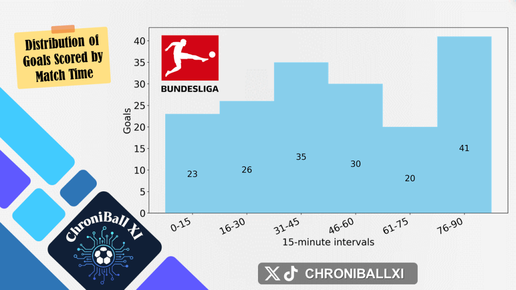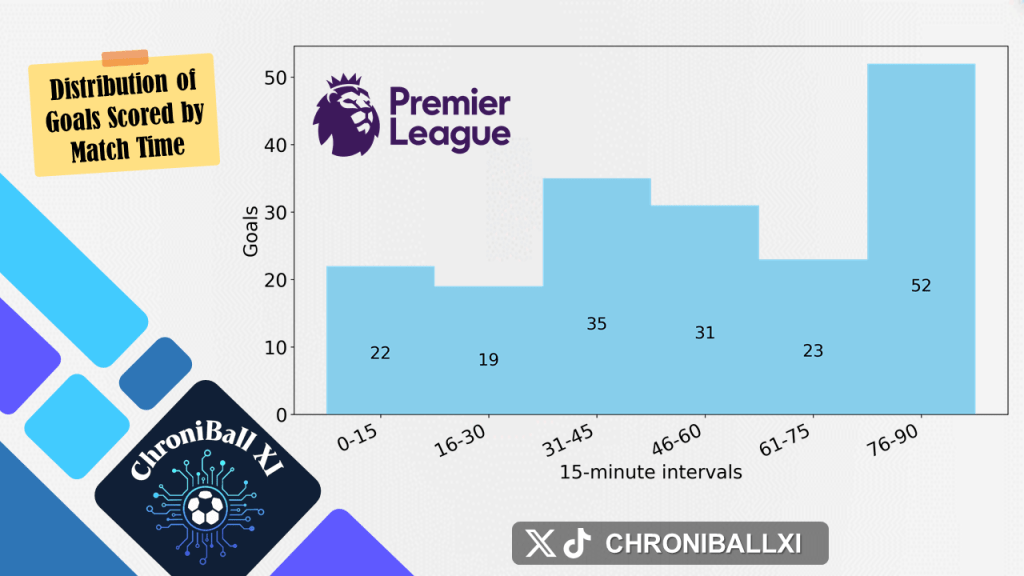– Goal distribution is shown in 15-minute intervals over 90 minutes.